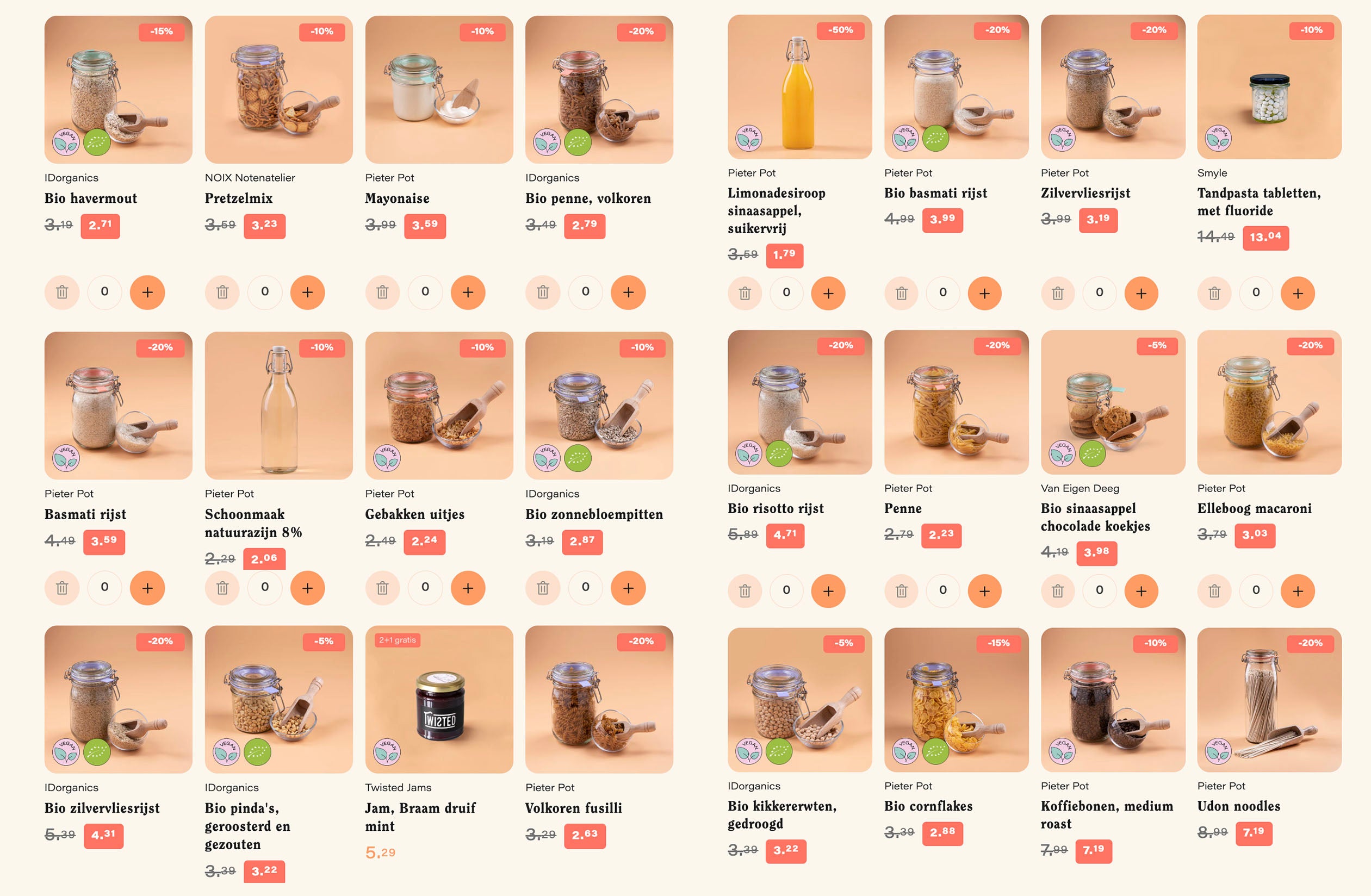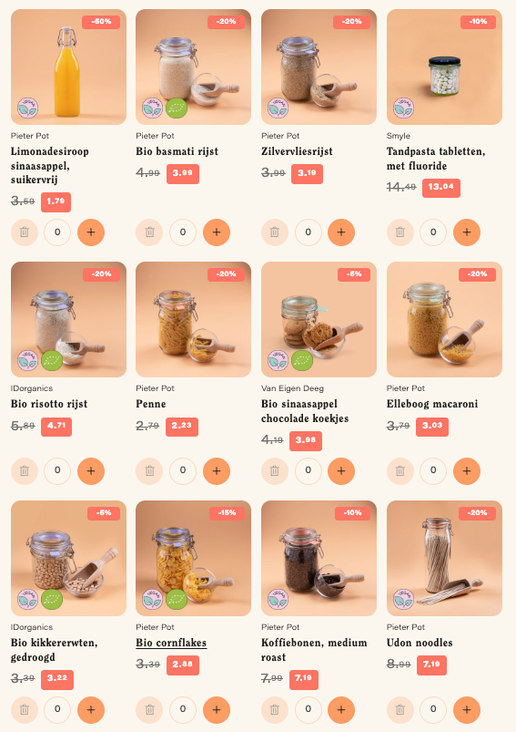 Kies je duurzame producten en reken ze af in je winkelmandje. Voor alle potten en flessen betaal je statiegeld.