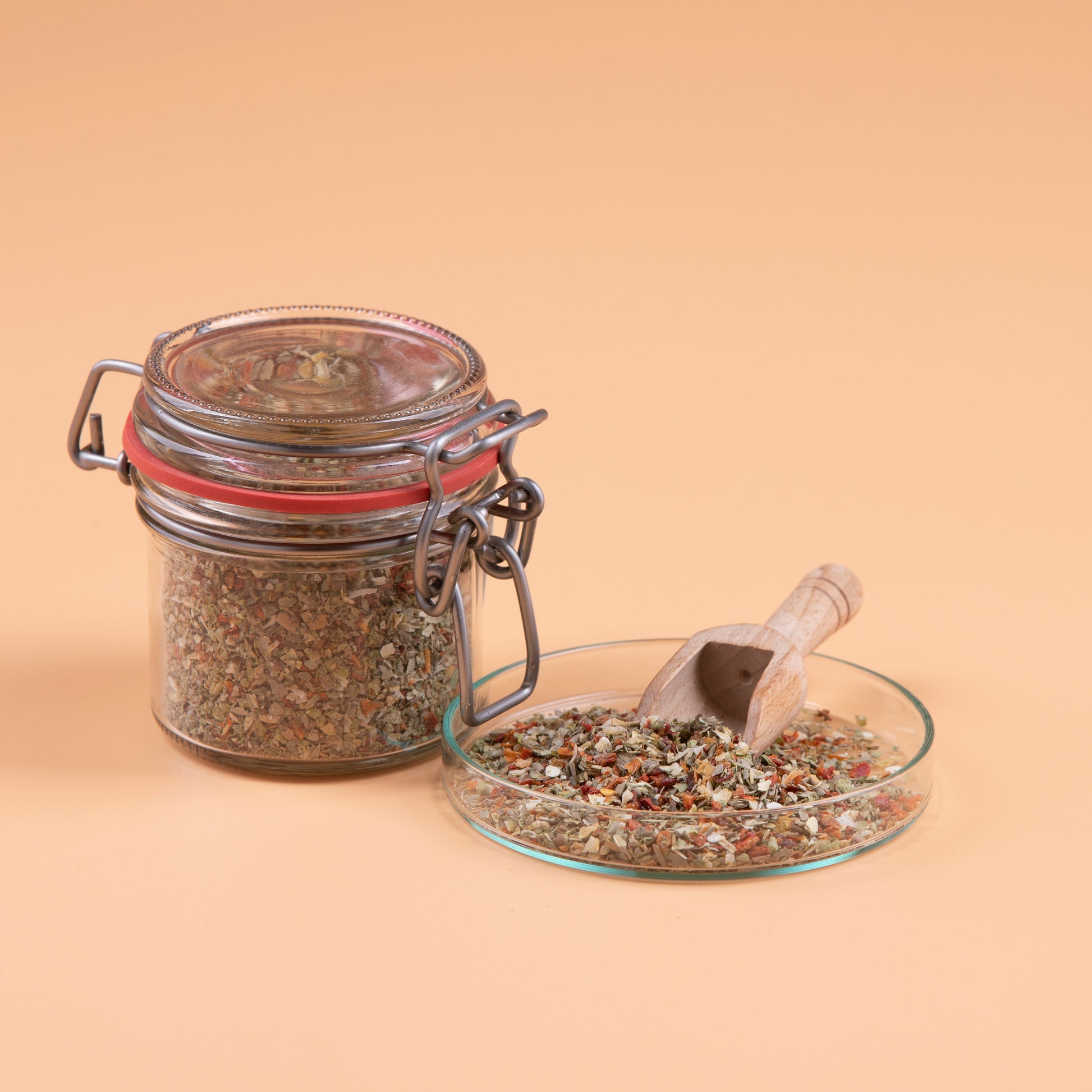Deze kruidenmix is een combinatie van alle lekkere kruiden uit het Middellandse zee gebied, waar de Italiaanse keuken zo op floreert. Marjoraan, oregano, paprika en ui geven de pastasaus of salade die typische Italiaanse smaak!