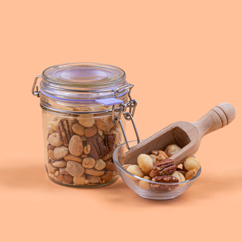 Gezouten notenmix met macadamia, cashewnoten, hazelnoten, pecannoten en amandelen. Heerlijk voor bij de borrel of als tussendoortje.