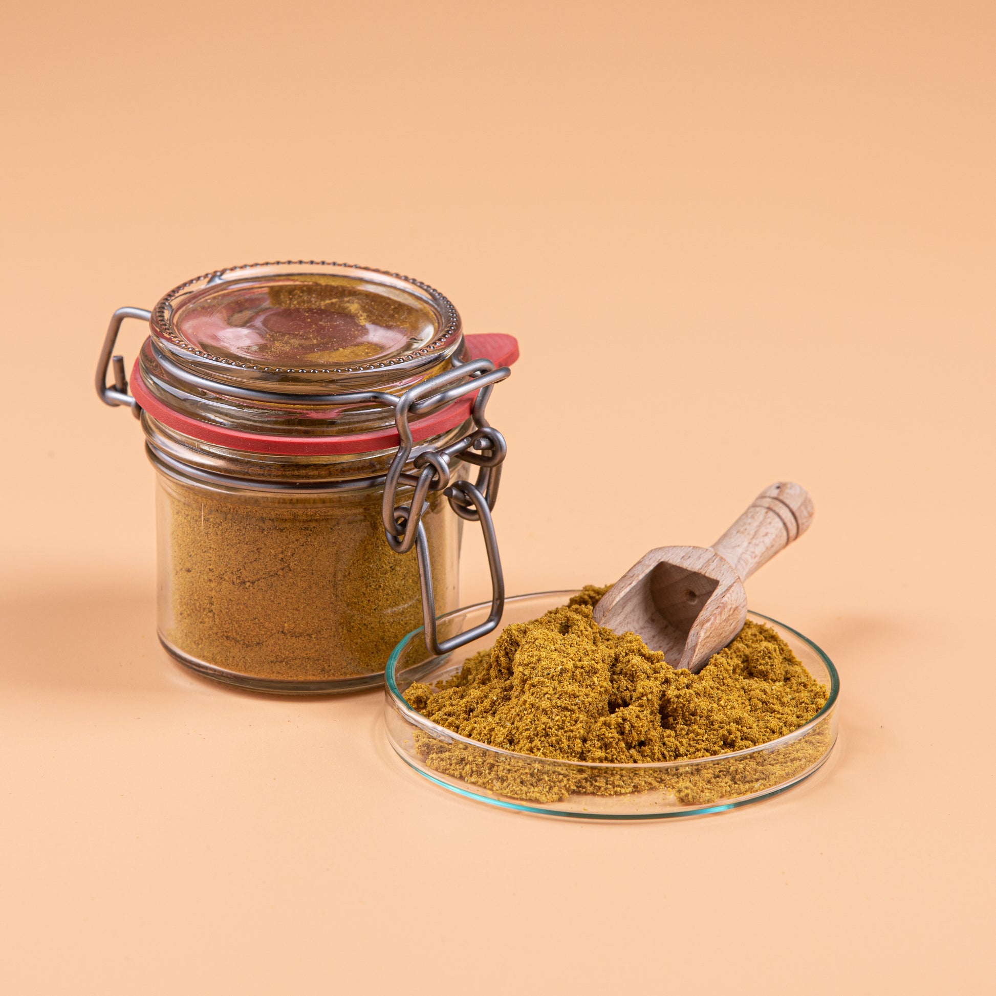 Ingrediënten: Koriander, komijnzaad, kurkuma, gember, ui, peper wit, knoflook, mononatrium glutamaat E621, chillies, sereh, kruidnagelen, peper, kaneel, anijszaad, kardamom, karwijzaad, raapolie